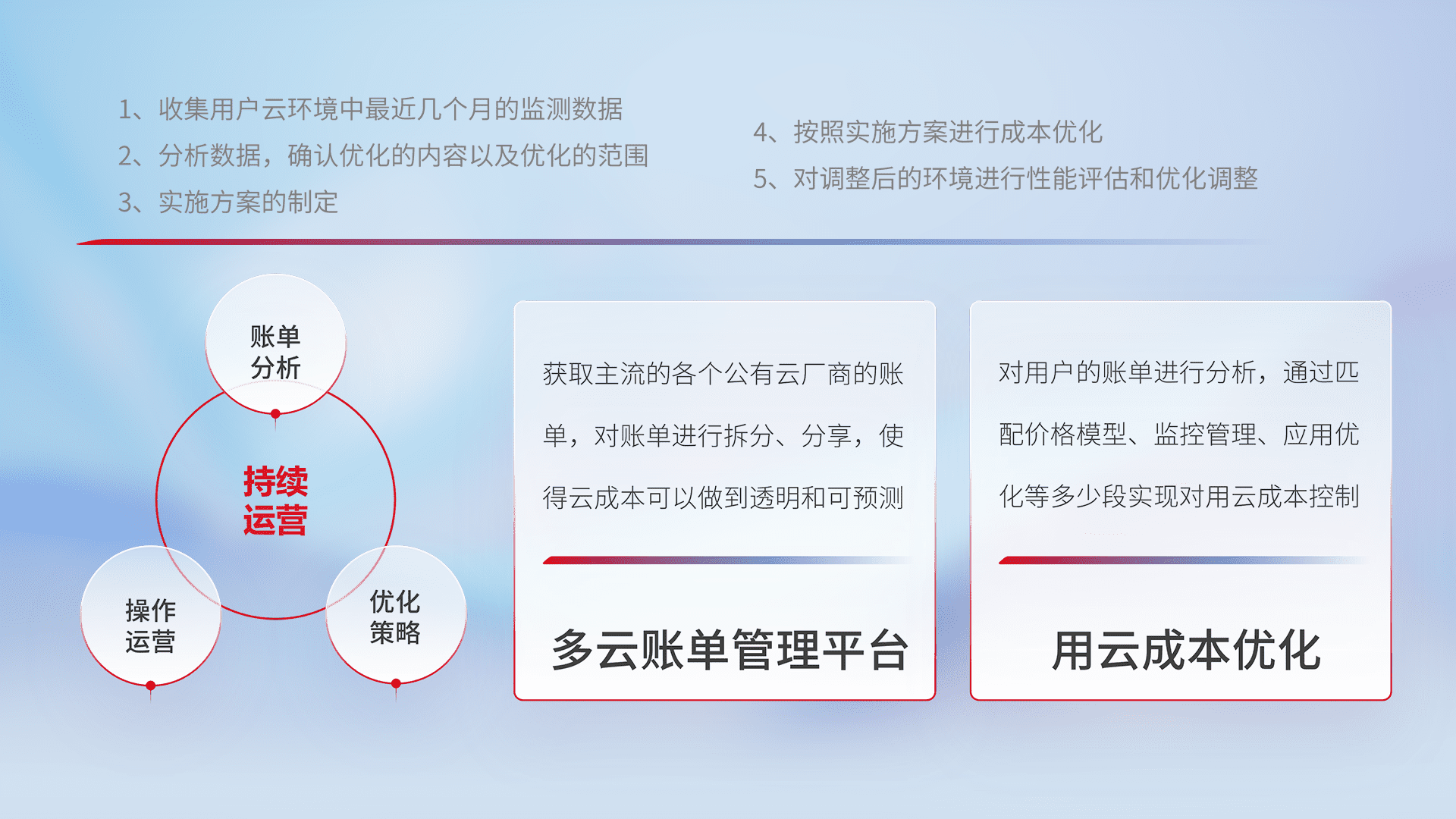 通过多云纳管,,,以统一的资源数据模型把客户的云资源进行抽象和封装,,进而实现对多云资源的统一操作,,,,保障云资源管理的可靠性、、、、稳定性与可用性。。。。量身定制化运维内容,,配置、、、、开发运维、、、、补丁管理、、、、备份、、监控、、、、认证和访问管理、、审计和日常巡检等,,保障在用云过程中的可靠度,,稳定度以及高可用率。。